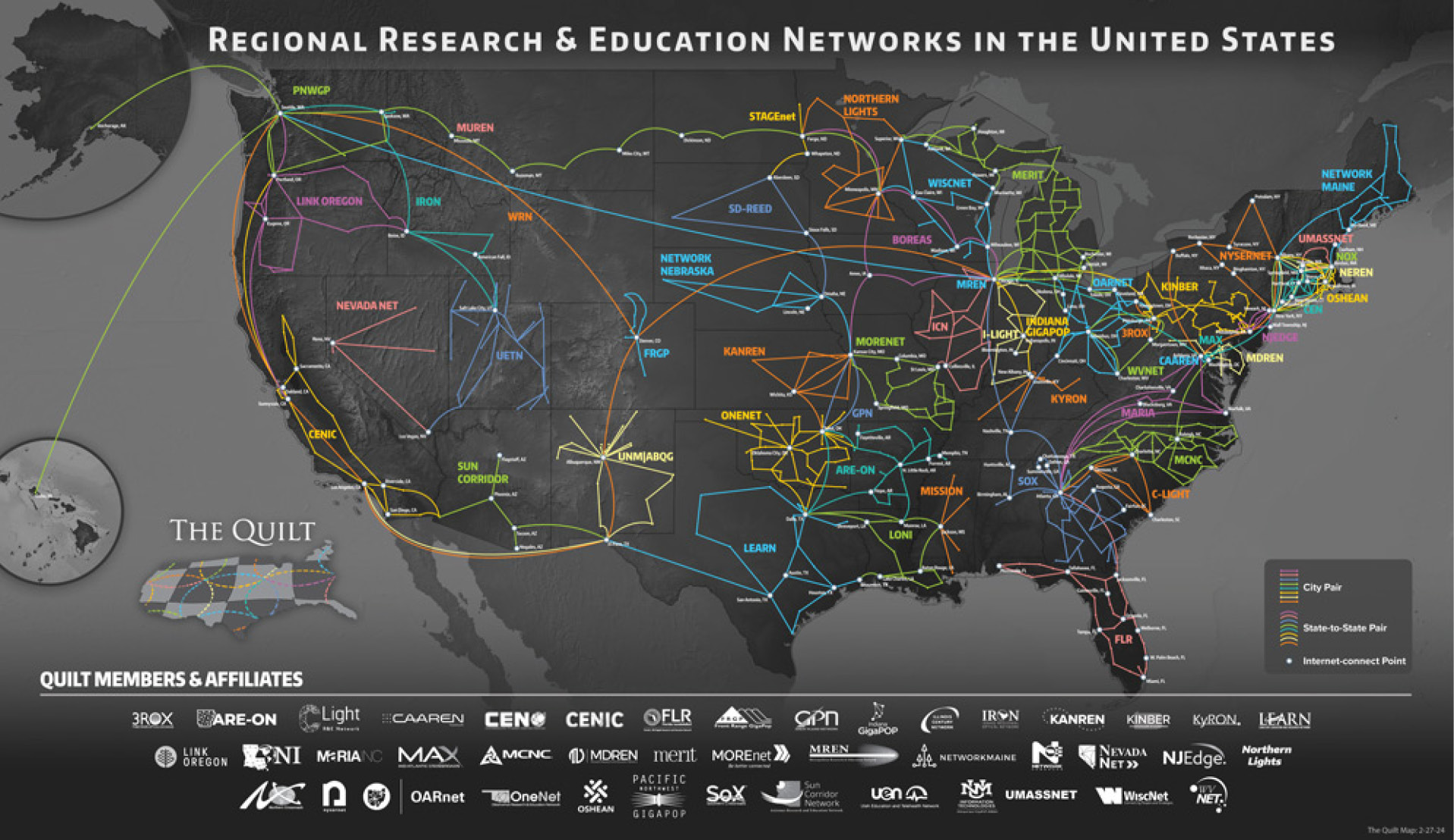 The Quilt is the national coalition of non-profit U.S. regional research and education networks representing 43 networks across the country. Members of The Quilt provide advanced network services and applications to over 900 universities and thousands of other educational and community anchor institutions. Through the collaborative forum of The Quilt, member organizations have access to a broader set of expertise and knowledge than any single organization working on its own. Only through working together do we collectively advance our common public service mission.